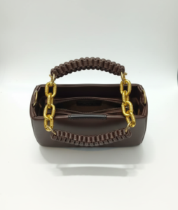 Stylish women’s mini handbag crafted from premium leather-finish material with an elegant brown and black color combination. Features a braided top handle with gold-tone chain detailing and a secure closure. Compact yet spacious for daily essentials, ideal for party, casual, and evening wear.